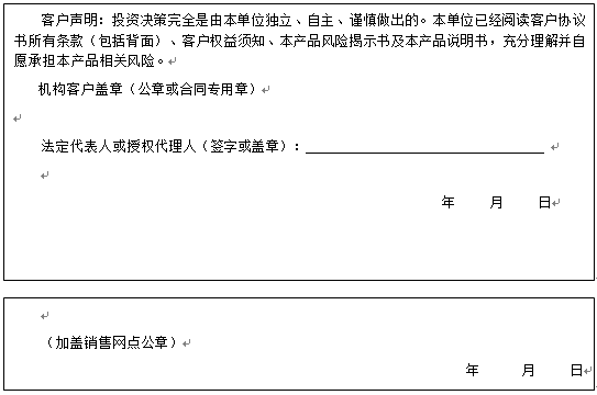客户签名: ( 客户声明:投资决策完全是由客户独立、自主、谨慎做出的。客户已经阅读客户协议书所有条款(包括背面)、客户权益须知、本产品风险揭示书及本产品说明书,充分理解并自愿承担本产品相关风险。)