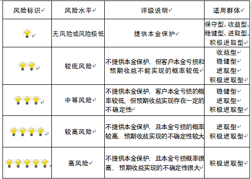 本产品为非保本浮动收益型理财产品,不保证本金和收益,请您充分认识投资风险,谨慎投资。本期产品期限为154天(中国建设银行有权对产品进行展期或提前终止),存续期内,产品不接受申购或赎回申请。本期产品内部风险评级级别为盏警示灯 ,风险水平属于较低风险。最不利情况下,您将损失全部收益甚至包括全部本金。本理财产品适用于收益型、稳健型、进取型 积极进取型客户。