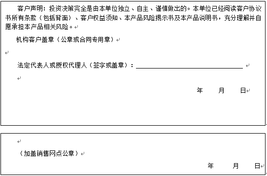 客户签名:                                    客户声明:投资决策完全是由客户独立、自主、谨慎做出的。客户已经阅读客户协议书所有条款(包括背面)、客户权益须知、本产品风险揭示书及本产品说明书,充分理解并自愿承担本产品相关风险。)