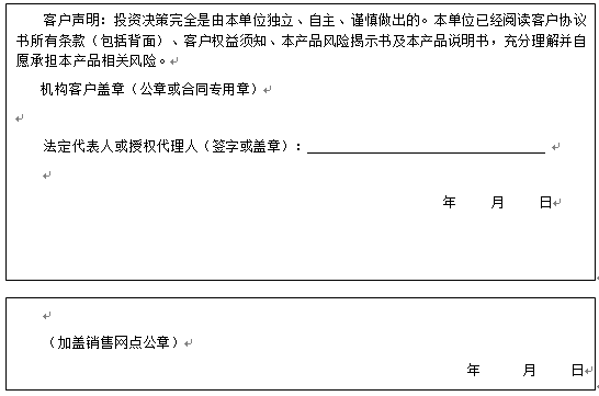 客户签名: ( 客户声明:投资决策完全是由客户独立、自主、谨慎做出的。客户已经阅读客户协议书所有条款(包括背面)、客户权益须知、本产品风险揭示书及本产品说明书,充分理解并自愿承担本产品相关风险。)