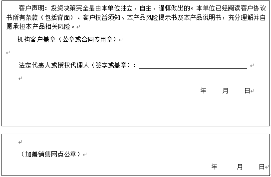 客户签名: ( 客户声明:投资决策完全是由客户独立、自主、谨慎做出的。客户已经阅读客户协议书所有条款(包括背面)、客户权益须知、本产品风险揭示书及本产品说明书,充分理解并自愿承担本产品相关风险。)