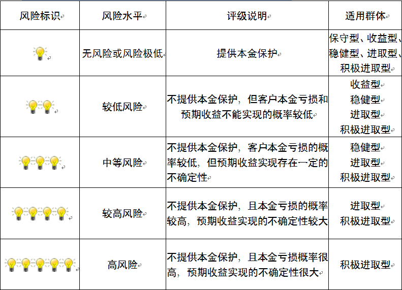 本产品为非保本浮动收益型理财产品,不保证本金和收益,请您充分认识投资风险,谨慎投资。本期产品期限为224天(中国建设银行有权对产品进行展期或提前终止),存续期内,产品不接受申购或赎回申请。本期产品内部风险评级级别为三盏警示灯 ,风险水平属于中等风险。最不利情况下,您将损失全部收益甚至包括全部本金。本理财产品适用于稳健型、进取型 、积极进取型客户。