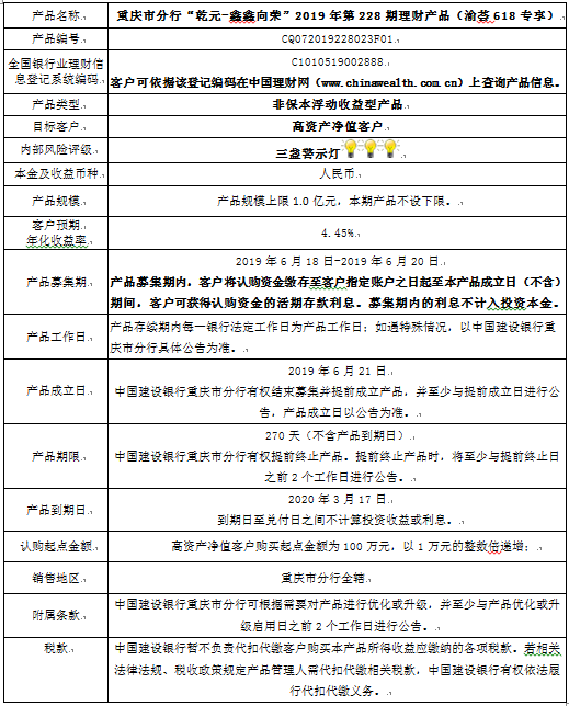 中国建设银行重庆市分行“乾元-鑫鑫向荣” 2019年第228期理财产品风险揭示书和产品说明书