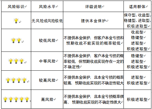 本产品为非保本浮动收益型理财产品,不保证本金和收益,请您充分认识投资风险,谨慎投资。本期产品期限为361天(中国建设银行有权对产品进行展期或提前终止),存续期内,产品不接受申购或赎回申请。本期产品内部风险评级级别为盏警示灯 ,风险水平属于较低风险。最不利情况下,您将损失全部收益甚至包括全部本金。本理财产品适用于收益型、稳健型、进取型 积极进取型客户。