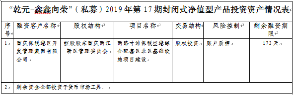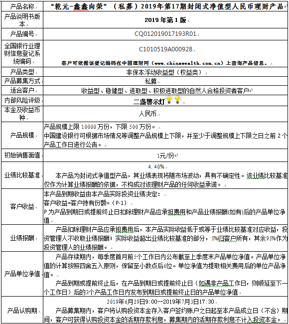 中国建设银行重庆市分行“乾元-鑫鑫向荣”(私募)2019年 第17期封闭式净值型人民币理财产品风险揭示书和产品说明书