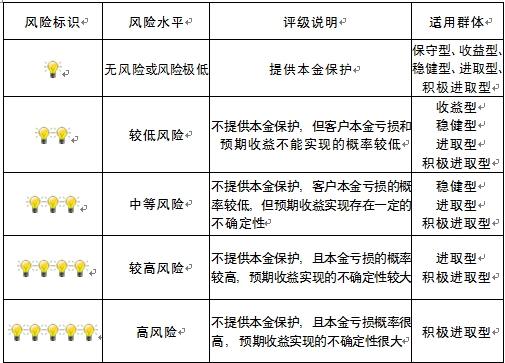 本产品为非保本浮动收益型理财产品,不保证本金和收益,请您充分认识投资风险,谨慎投资。本期产品期限为273天(中国建设银行有权对产品进行展期或提前终止),存续期内,产品不接受申购或赎回申请。本期产品内部风险评级级别为盏警示灯 ,风险水平属于较低风险。最不利情况下,您将损失全部收益甚至包括全部本金。本理财产品适用于收益型、稳健型、进取型 积极进取型客户。