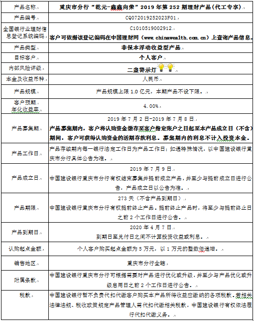 中国建设银行重庆市分行“乾元-鑫鑫向荣” 2019年第252期理财产品风险揭示书和产品说明书