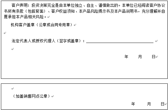 客户签名:                                    客户声明:投资决策完全是由客户独立、自主、谨慎做出的。客户已经阅读客户协议书所有条款(包括背面)、客户权益须知、本产品风险揭示书及本产品说明书,充分理解并自愿承担本产品相关风险。)