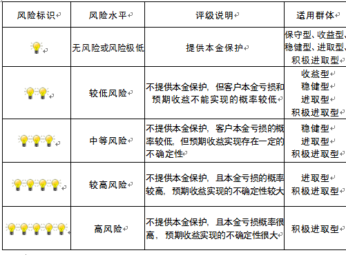 本产品为非保本浮动收益型理财产品,不保证本金和收益,请您充分认识投资风险,谨慎投资。本期产品期限104天(中国建设银行有权对产品进行展期或提前终止),存续期内,产品不接受申购或赎回申请。本期产品内部风险评级级别为盏警示灯,风险水平属于中等风险。最不利情况下,您将损失全部收益甚至包括全部本金。本理财产品适用于稳健型进取型 积极进取型客户。