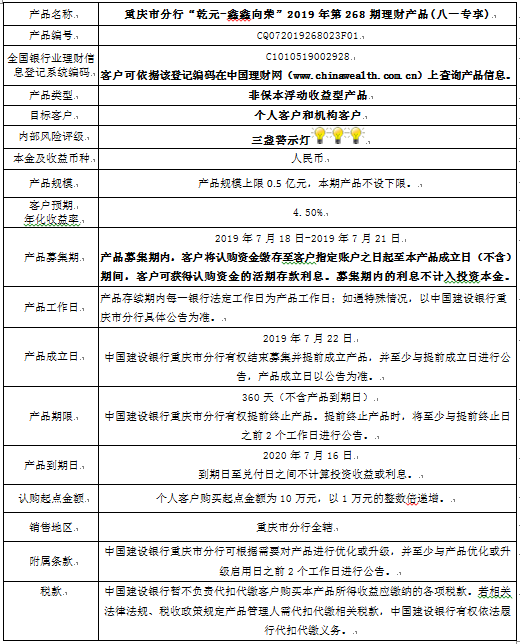 1.本期产品规模上限:0.5亿元。在本期产品募集期内,对本期产品的认购金额达到本期理财产品规模上限,则中国建设银行重庆市分行有权利但无义务停止本期产品的认购,已经认购成功的客户投资权益不受影响。