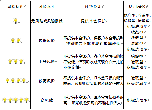 本产品为非保本浮动收益型理财产品,不保证本金和收益,请您充分认识投资风险,谨慎投资。本期产品期限为124天(中国建设银行有权对产品进行展期或提前终止),存续期内,产品不接受申购或赎回申请。本期产品内部风险评级级别为三盏警示灯,风险水平属于中等风险。最不利情况下,您将损失全部收益甚至包括全部本金。本理财产品适用于稳健型、进取型 、积极进取型客户。