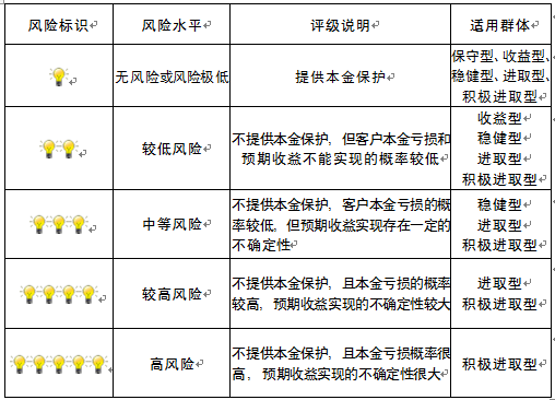 本产品为非保本浮动收益型理财产品,不保证本金和收益,请您充分认识投资风险,谨慎投资。本期产品期限为280天(中国建设银行有权对产品进行展期或提前终止),存续期内,产品不接受申购或赎回申请。本期产品内部风险评级级别为盏警示灯 ,风险水平属于中等风险。最不利情况下,您将损失全部收益甚至包括全部本金。本理财产品适用于稳健型、进取型 积极进取型客户。