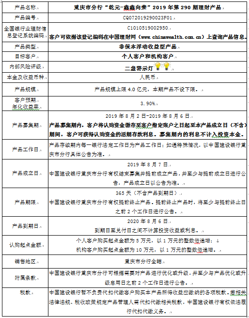 3.中国建设银行重庆市分行可根据市场情况等调整产品规模上、下限,并最迟于调整规模上下限当日进行公告。