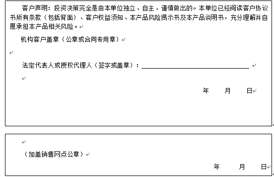 客户签名: ( 客户声明:投资决策完全是由客户独立、自主、谨慎做出的。客户已经阅读客户协议书所有条款(包括背面)、客户权益须知、本产品风险揭示书及本产品说明书,充分理解并自愿承担本产品相关风险。)