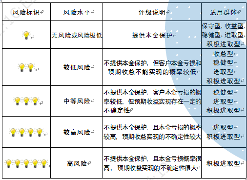 本产品为非保本浮动收益型理财产品,不保证本金和收益,请您充分认识投资风险,谨慎投资。本期产品期限为105天(中国建设银行有权对产品进行展期或提前终止),存续期内,产品不接受申购或赎回申请。本期产品内部风险评级级别为盏警示灯 ,风险水平属于中等风险。最不利情况下,您将损失全部收益甚至包括全部本金。本理财产品适用于稳健型、进取型 积极进取型客户。