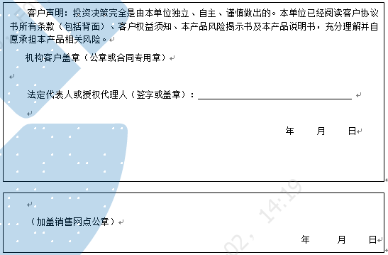 客户签名:                                    客户声明:投资决策完全是由客户独立、自主、谨慎做出的。客户已经阅读客户协议书所有条款(包括背面)、客户权益须知、本产品风险揭示书及本产品说明书,充分理解并自愿承担本产品相关风险。)
