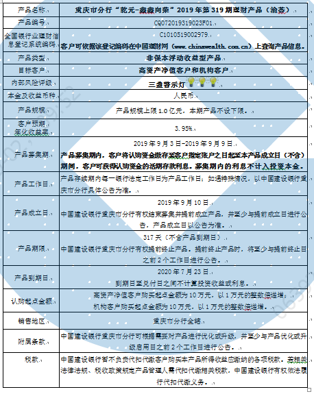 3.中国建设银行重庆市分行可根据市场情况等调整产品规模上、下限,并最迟于调整规模上下限当日进行公告。