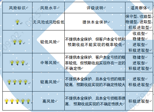 本产品为非保本浮动收益型理财产品,不保证本金和收益,请您充分认识投资风险,谨慎投资。本期产品期限为363天(中国建设银行有权对产品进行展期或提前终止),存续期内,产品不接受申购或赎回申请。本期产品内部风险评级级别为二盏警示灯 ,风险水平属于较低风险。最不利情况下,您将损失全部收益甚至包括全部本金。本理财产品适用于收益型、稳健型、进取型 、积极进取型客户。