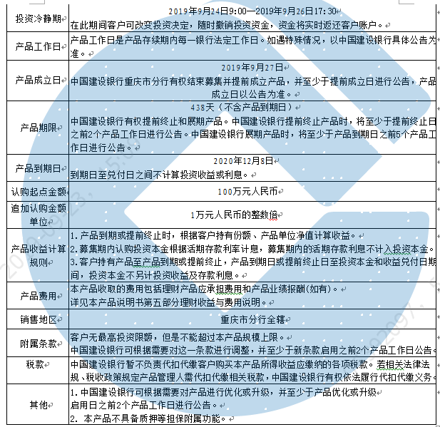(一)中国建设银行重庆市分行通过中国建设银行网站(www.ccb.com)披露产品以下相关信息:在产品正常成立、产品终止、发生对产品产生重大影响之情形后的5个产品工作日内发布产品成立、产品终止、重大影响事件等信息;如中国建设银行拟调整产品规模上下限、调整业绩比较基准、调整投资范围、投资品种或投资比例、优化或升级产品、行使提前终止权,则需在调整规模上下限之日、新的业绩比较基准启用日、新的投资范围、投资品种或投资比例启用日、产品优化或升级启用日、提前终止日等相关日之前至少2个产品工作日进行公告;如中国建设银行拟调整本产品相关费用费率或延长产品期限,则需在费用费率调整日或产品到期日之前至少5个产品工作日进行公告;如发生产品到期时的延迟/分次兑付情形,则于该情形发生后的2个产品工作日内进行公告;产品存续期内,每季度首月前5个工作日内公布截至上季度末产品的资产净值、份额净值和其他重要信息;产品到期或提前终止后,在产品到期日或提前终止日(如遇非产品工作日,则顺延至下一个工作日)后的3个产品工作日内发布到期日或提前终止日的产品资产净值、份额净值和其他重要信息。