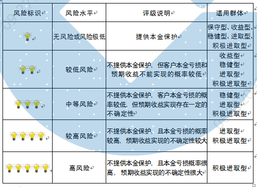本产品为非保本浮动收益型理财产品,不保证本金和收益,请您充分认识投资风险,谨慎投资。本期产品期限为98天(中国建设银行有权对产品进行展期或提前终止),存续期内,产品不接受申购或赎回申请。本期产品内部风险评级级别为盏警示灯 ,风险水平属于较低风险。最不利情况下,您将损失全部收益甚至包括全部本金。本理财产品适用于收益型、稳健型、进取型 积极进取型客户。