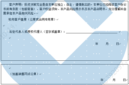 客户签名: ( 客户声明:投资决策完全是由客户独立、自主、谨慎做出的。客户已经阅读客户协议书所有条款(包括背面)、客户权益须知、本产品风险揭示书及本产品说明书,充分理解并自愿承担本产品相关风险。)