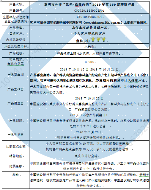 3.中国建设银行重庆市分行可根据市场情况等调整产品规模上、下限,并最迟于调整规模上下限当日进行公告。