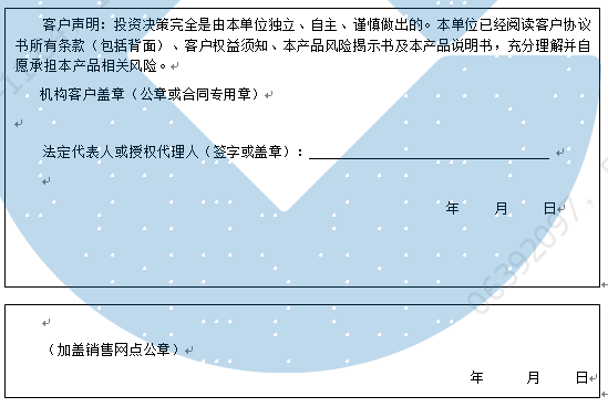 客户签名:                                    客户声明:投资决策完全是由客户独立、自主、谨慎做出的。客户已经阅读客户协议书所有条款(包括背面)、客户权益须知、本产品风险揭示书及本产品说明书,充分理解并自愿承担本产品相关风险。)