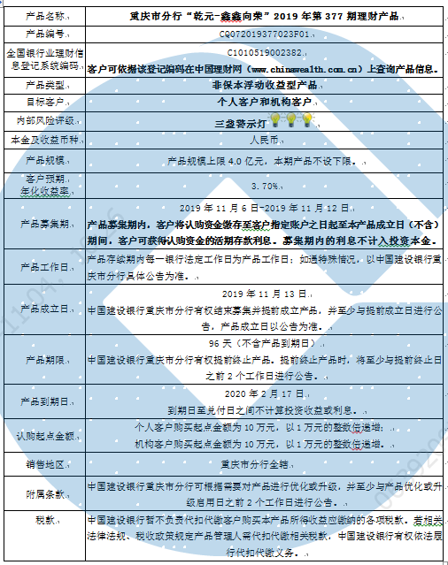 中国建设银行重庆市分行“乾元-鑫鑫向荣” 2019年第377期理财产品风险揭示书和产品说明书
