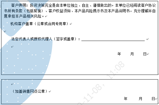 客户签名:                                    客户声明:投资决策完全是由客户独立、自主、谨慎做出的。客户已经阅读客户协议书所有条款(包括背面)、客户权益须知、本产品风险揭示书及本产品说明书,充分理解并自愿承担本产品相关风险。)