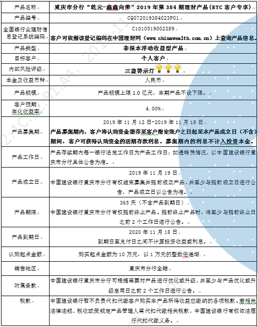 中国建设银行重庆市分行“乾元-鑫鑫向荣” 2019年第384期理财产品风险揭示书和产品说明书