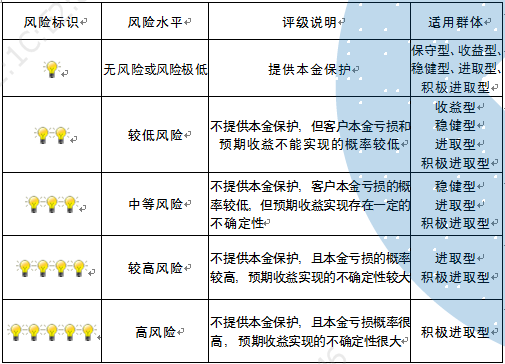 本产品为非保本浮动收益型理财产品,不保证本金和收益,请您充分认识投资风险,谨慎投资。本期产品期限为184天(中国建设银行有权对产品进行展期或提前终止),存续期内,产品不接受申购或赎回申请。本期产品内部风险评级级别为三盏警示灯,风险水平属于中等风险。最不利情况下,您将损失全部收益甚至包括全部本金。本理财产品适用于稳健型、进取型 、积极进取型客户。