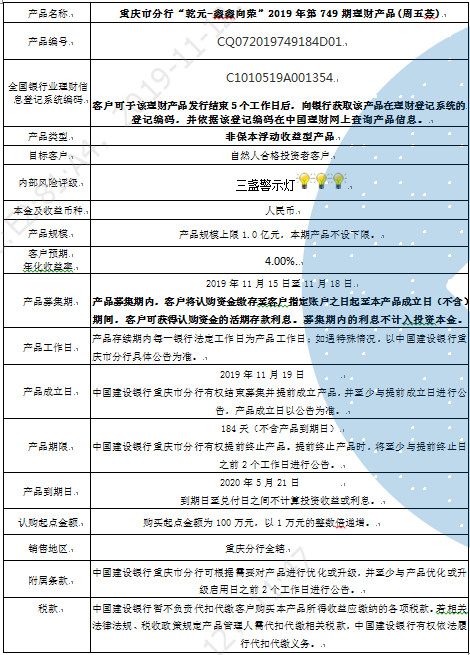 3.中国建设银行重庆市分行可根据市场情况等调整产品规模上、下限,并最迟于调整规模上下限当日进行公告。