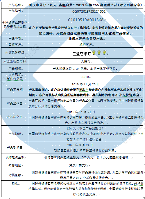 中国建设银行重庆市分行“乾元-鑫鑫向荣” 2019年第755期理财产品风险揭示书和产品说明书