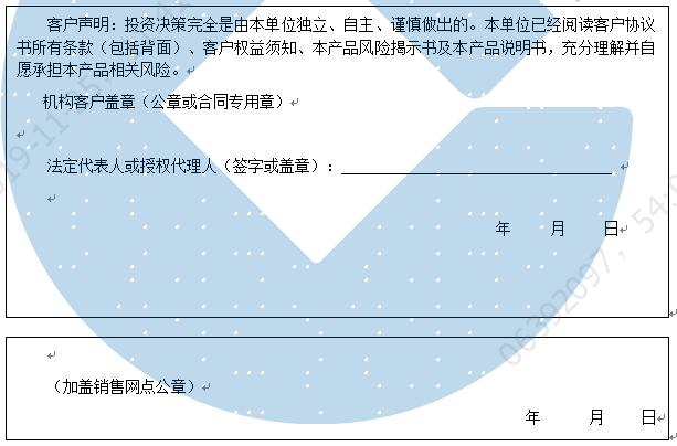 客户签名:                                    客户声明:投资决策完全是由客户独立、自主、谨慎做出的。客户已经阅读客户协议书所有条款(包括背面)、客户权益须知、本产品风险揭示书及本产品说明书,充分理解并自愿承担本产品相关风险。)