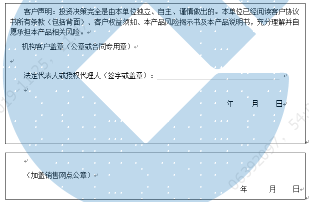 客户签名:                                    客户声明:投资决策完全是由客户独立、自主、谨慎做出的。客户已经阅读客户协议书所有条款(包括背面)、客户权益须知、本产品风险揭示书及本产品说明书,充分理解并自愿承担本产品相关风险。)