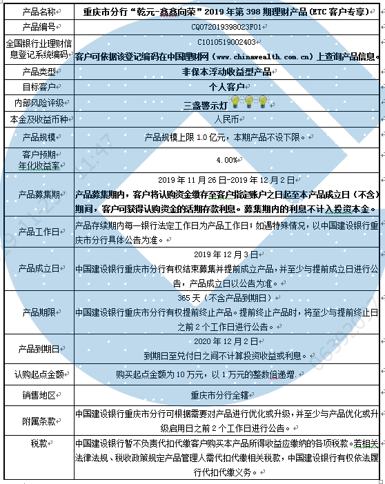 中国建设银行重庆市分行“乾元-鑫鑫向荣” 2019年第398期理财产品风险揭示书和产品说明书