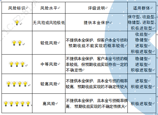 本产品为非保本浮动收益型理财产品,不保证本金和收益,请您充分认识投资风险,谨慎投资。本期产品期限184天(中国建设银行有权对产品进行展期或提前终止),存续期内,产品不接受申购或赎回申请。本期产品内部风险评级级别为盏警示灯,风险水平属于中等风险。最不利情况下,您将损失全部收益甚至包括全部本金。本理财产品适用于稳健型进取型 积极进取型客户。