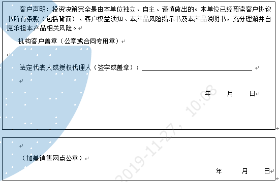 客户签名:                                    客户声明:投资决策完全是由客户独立、自主、谨慎做出的。客户已经阅读客户协议书所有条款(包括背面)、客户权益须知、本产品风险揭示书及本产品说明书,充分理解并自愿承担本产品相关风险。)