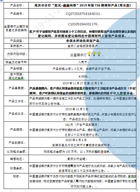 中国建设银行重庆市分行“乾元-鑫鑫向荣” 2019年第758期理财产品风险揭示书和产品说明书