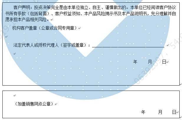 客户签名:                                    客户声明:投资决策完全是由客户独立、自主、谨慎做出的。客户已经阅读客户协议书所有条款(包括背面)、客户权益须知、本产品风险揭示书及本产品说明书,充分理解并自愿承担本产品相关风险。)