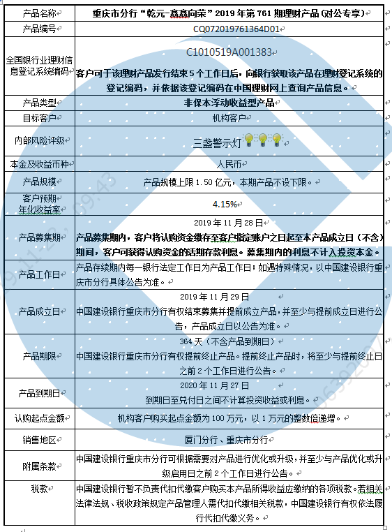 中国建设银行重庆市分行“乾元-鑫鑫向荣” 2019年第761期理财产品风险揭示书和产品说明书