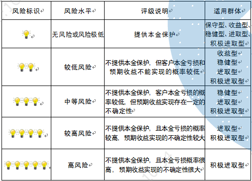 本产品为非保本浮动收益型理财产品,不保证本金和收益,请您充分认识投资风险,谨慎投资。本期产品期限为272天(中国建设银行有权对产品进行展期或提前终止),存续期内,产品不接受申购或赎回申请。本期产品内部风险评级级别为三盏警示灯 ,风险水平属于中等风险。最不利情况下,您将损失全部收益甚至包括全部本金。本理财产品适用于稳健型、进取型 、积极进取型客户。