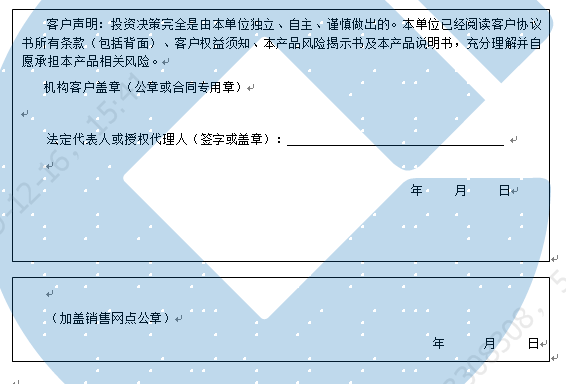 客户签名: ( 客户声明:投资决策完全是由客户独立、自主、谨慎做出的。客户已经阅读客户协议书所有条款(包括背面)、客户权益须知、本产品风险揭示书及本产品说明书,充分理解并自愿承担本产品相关风险。)