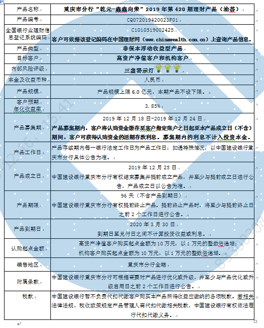 3.中国建设银行重庆市分行可根据市场情况等调整产品规模上、下限,并最迟于调整规模上下限当日进行公告。