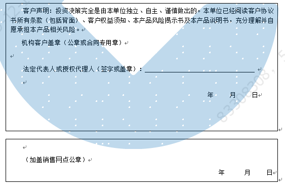 客户签名:                                    客户声明:投资决策完全是由客户独立、自主、谨慎做出的。客户已经阅读客户协议书所有条款(包括背面)、客户权益须知、本产品风险揭示书及本产品说明书,充分理解并自愿承担本产品相关风险。)