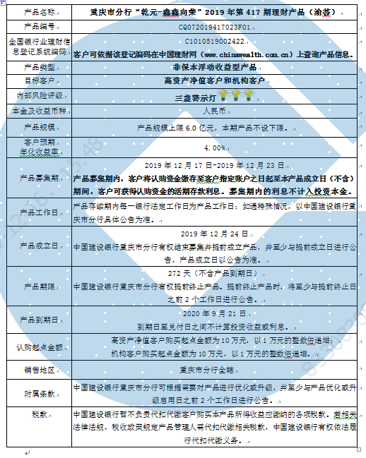 中国建设银行重庆市分行“乾元-鑫鑫向荣” 2019年第417期理财产品风险揭示书和产品说明书