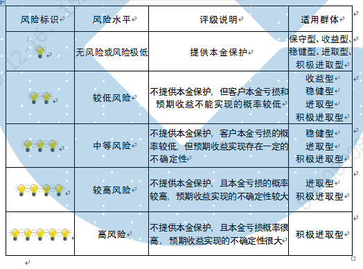 本产品为非保本浮动收益型理财产品,不保证本金和收益,请您充分认识投资风险,谨慎投资。本期产品期限为125天(中国建设银行有权对产品进行展期或提前终止),存续期内,产品不接受申购或赎回申请。本期产品内部风险评级级别为盏警示灯 ,风险水平属于较低风险。最不利情况下,您将损失全部收益甚至包括全部本金。本理财产品适用于收益型、稳健型、进取型 积极进取型客户。