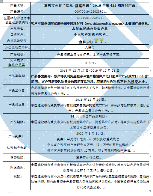 2019年第422期理财产品说明书