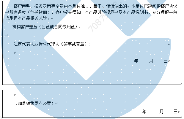 客户签名:                                    客户声明:投资决策完全是由客户独立、自主、谨慎做出的。客户已经阅读客户协议书所有条款(包括背面)、客户权益须知、本产品风险揭示书及本产品说明书,充分理解并自愿承担本产品相关风险。)