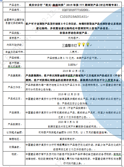 中国建设银行重庆市分行“乾元-鑫鑫向荣” 2019年第777期理财产品风险揭示书和产品说明书
